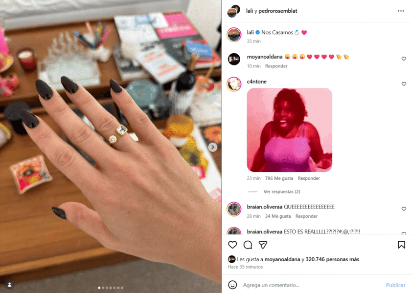 La oficialización del compromiso llega tras meses de versiones que vinculaban a la pareja con una posible boda. En agosto pasado, el paso de la artista por el taller del diseñador Mario Vidal alimentó los rumores que hoy quedaron ratificados por los propios protagonistas. La publicación fue musicalizada con una pieza de Charly García, lo que añadió un componente simbólico al anuncio.