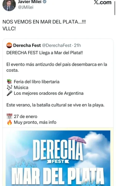 Por otro lado, Milei confirmó hoy desde sus redes sociales que a fines de mes participa de la nueva edición del festival Derecha Fest que se realizará en la ciudad balnearia de Mar del Plata el 27 de enero.