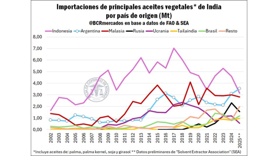 Este fenómeno ha permitido que el aceite de soja y girasol capture el 53,1% del total importado por India, desplazando a proveedores tradicionales de palma como Indonesia.