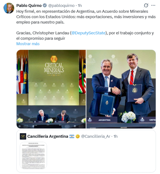 La confirmación de la inversión coincidió con la participación de la delegación argentina en la cumbre de minerales críticos en Washington. El evento, encabezado por el secretario de Estado, Marco Rubio, y el vicepresidente, JD Vance, buscó consolidar cadenas de suministro seguras para reducir la dependencia de insumos provenientes de China.