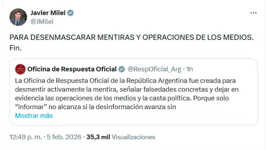 El escenario de hostilidad entre la gestión de Javier Milei y el periodismo sumó un nuevo instrumento institucional con la creación de la “Oficina de Respuesta Oficial”. Este perfil en la plataforma X nació con la misión declarada de “desmentir activamente la mentira” y exponer lo que el oficialismo considera maniobras de la “casta política”. Según el comunicado de apertura, la iniciativa surge como una necesidad ante el avance de la desinformación, diferenciándose de los mecanismos de censura al presentarse como una “voz oficial” que aporta más datos al debate público.