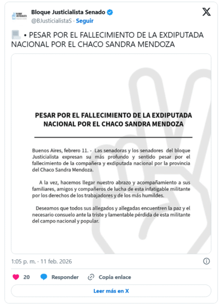 La política chaqueña amaneció de luto tras conocerse el deceso de la exlegisladora nacional Sandra Mendoza, quien a los 62 años perdió la vida debido a un cuadro de diabetes que se agravó recientemente. La noticia irrumpió en plena actividad legislativa del Senado, donde se le rindió tributo con un minuto de silencio y palabras de reconocimiento a su trayectoria militante. Referentes del justicialismo destacaron su firmeza ideológica y su compromiso social, mientras que figuras como Cristina Kirchner expresaron sus condolencias resaltando su espíritu luchador dentro del peronismo.