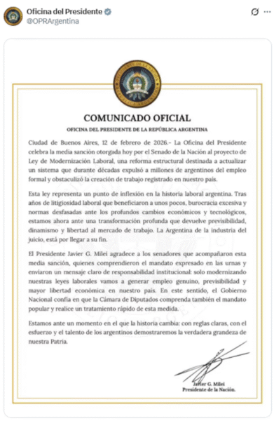 El Poder Ejecutivo manifestó su entusiasmo tras la aprobación en el Senado del proyecto que busca transformar el paradigma de las relaciones de trabajo en el país. El presidente Javier Milei calificó el suceso como un quiebre sustancial frente a normativas del pasado, destacando que el respaldo parlamentario de 42 senadores contra 30 rechazos brinda la seguridad jurídica necesaria para fomentar la inversión y el empleo formal. Desde la Casa Rosada interpretaron este avance como una muestra de madurez política por parte de la oposición dialoguista, lo que permite proyectar un mercado laboral más ágil y menos propenso a la litigiosidad.
