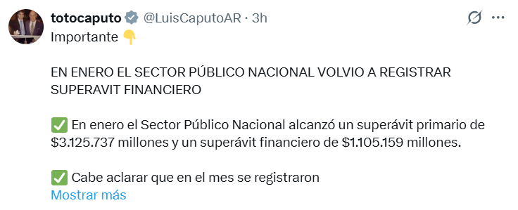 El Sector Público Nacional registró en enero un superávit primario de $3.125.737 millones. Una vez descontado el pago de intereses de la deuda pública, que ascendió a $2.020.578 millones, el Gobierno Nacional alcanzó un superávit financiero de $1.105.159 millones.
