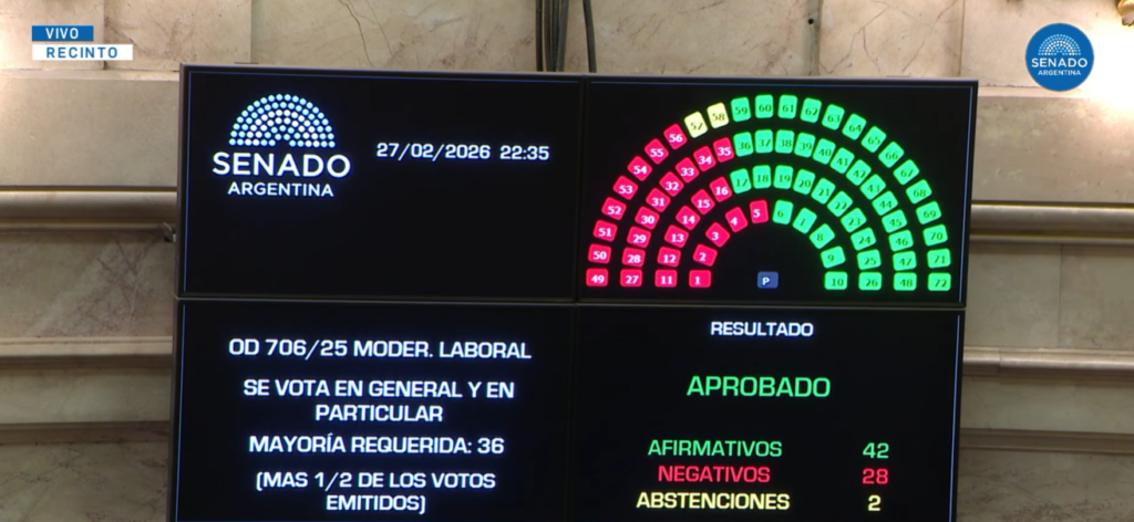 Con 42 votos a favor y el apoyo de la oposición dialoguista, el oficialismo convirtió en ley la modernización del sistema de trabajo. La norma reduce indemnizaciones, flexibiliza jornadas y crea un fondo para ceses laborales ante críticas del peronismo.