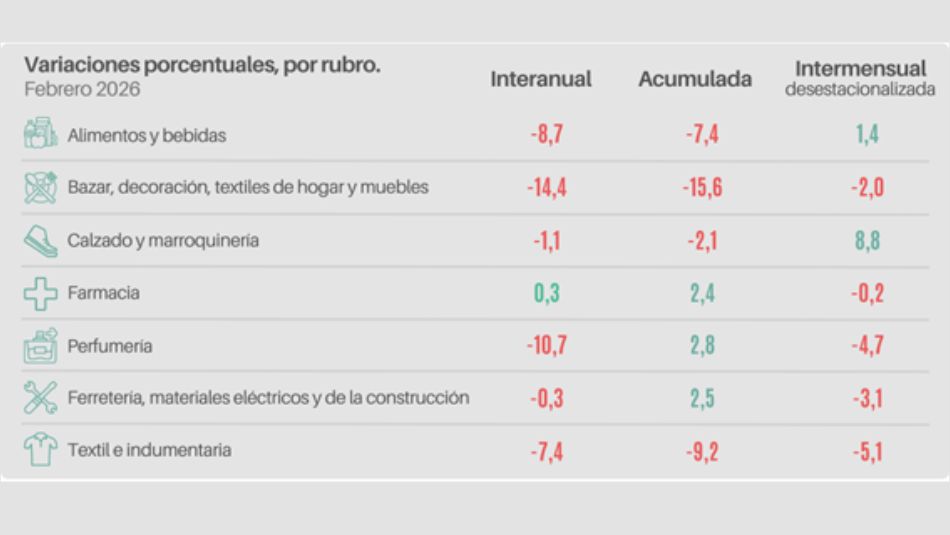 El análisis por sectores ratifica el proceso de achicamiento. De los siete rubros monitoreados, seis cerraron con resultados negativos. Las caídas más estrepitosas se dieron en Bazar y decoración (-14,4%), Perfumería (-10,7%) y Alimentos y bebidas (-8,7%).