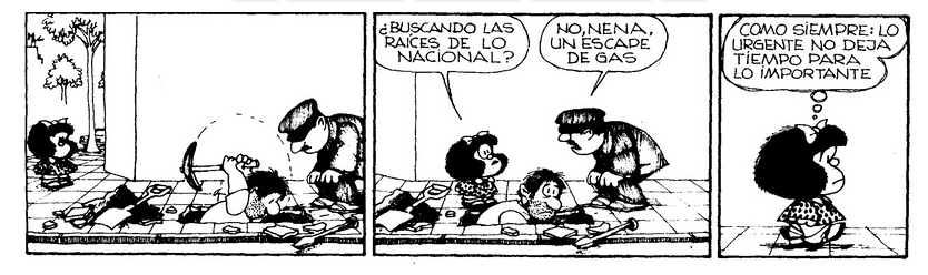 En fin, hace muchos años, en una viñeta, Mafalda le preguntaba a un operario que estaba haciendo un pozo en la vereda si estaba buscando las raíces del ser nacional. El trabajador le respondía que no, que estaban arreglando un caño. En el cuadro siguiente, Mafalda reflexiona que lo urgente siempre evita lo importante. Quizás a los actores de toda esta serie les haría bien darse una vuelta por ese caño roto.