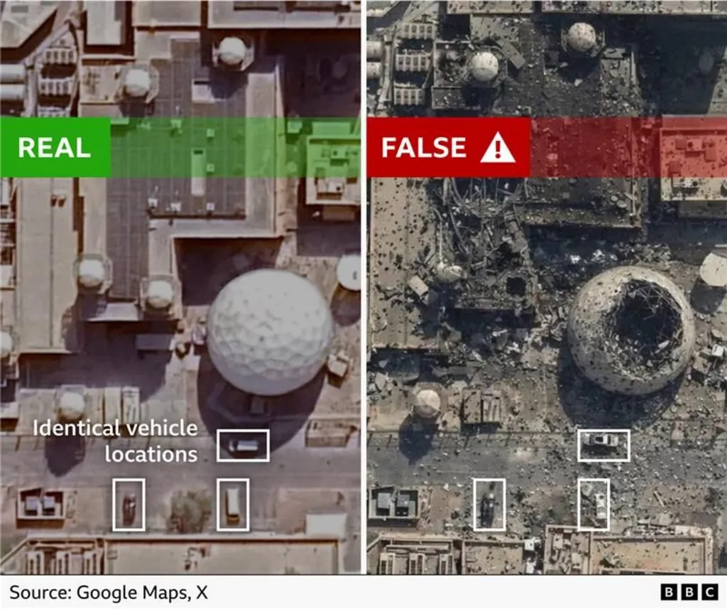 Una novedad preocupante que detectó el informe es la falsificación de imágenes satelitales. El diario estatal iraní The Tehran Times difundió una foto que supuestamente mostraba daños extensos en la base naval estadounidense en Bahréin, cuando en realidad se trataba de una imagen manipulada con IA a partir de una fotografía satelital real de febrero de 2025. El detector de marcas de agua SynthID de Google confirmó que la imagen fue generada o editada con una herramienta de inteligencia artificial de la propia compañía.