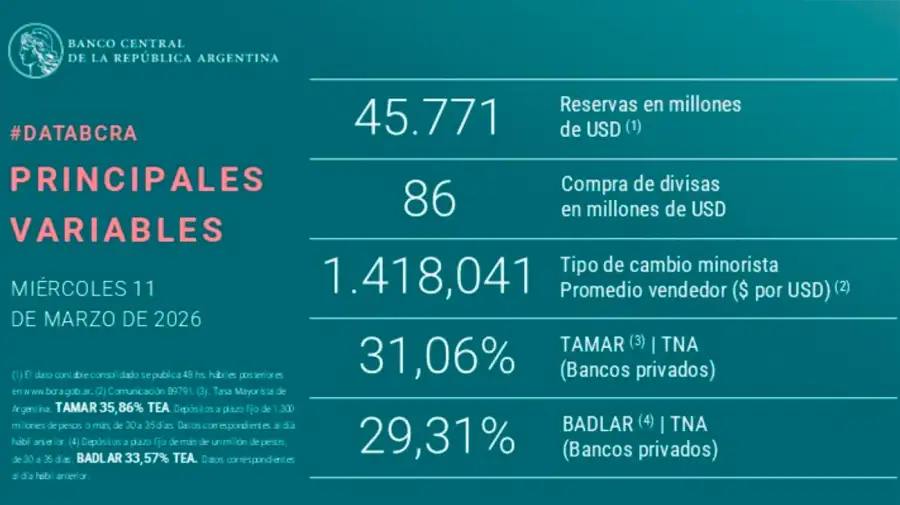 Paralelamente, el organismo monetario mantuvo el monitoreo sobre el nuevo esquema de bandas cambiarias. El dólar mayorista finalizó la rueda en $1.396, lo que situó a la divisa un 16,40% por debajo del límite superior de intervención, fijado actualmente en $1.624,97.