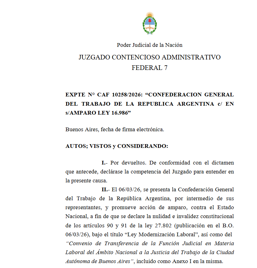 El Juzgado Contencioso Administrativo Federal 7 rechazó este miércoles la medida cautelar presentada por la Confederación General del Trabajo (CGT). La resolución judicial permite que continúe la aplicación de los artículos 90 y 91 de la Ley 27.802, los cuales disponen la transferencia de la Justicia Nacional del Trabajo al ámbito de la Ciudad Autónoma de Buenos Aires (CABA).