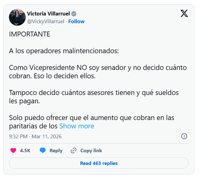 A través de un mensaje publicado en redes sociales, Villarruel aclaró que, en su rol institucional, no tiene injerencia en la definición de los salarios de los legisladores ni en la cantidad de asesores que posee cada senador. En ese contexto, planteó que la eventual suba salarial podría destinarse a fines solidarios.