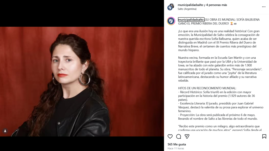 El jurado del IX Premio Internacional de Narrativa Breve Ribera del Duero anunció este jueves, en Madrid, que la ganadora del galardón es la escritora argentina Sofía Balbuena. La autora, nacida en la localidad de Salto en 1984, obtuvo el reconocimiento dotado con 25,000 euros por su obra inédita Personaje secundario.