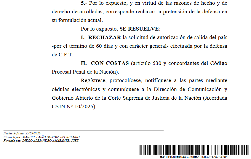 Sin embargo, el tribunal mantuvo la restricción al considerar que los motivos alegados para los viajes eran imprecisos, mencionando incluso una invitación para un encuentro deportivo que ya había sido suspendido oficialmente.