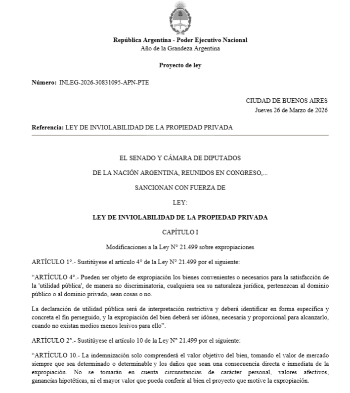 El gobierno nacional remitió al Congreso un paquete de reformas estructurales denominado Ley de Inviolabilidad de la Propiedad Privada. La iniciativa, firmada por el presidente Javier Milei, busca modificar leyes vigentes para dinamizar el mercado inmobiliario, atraer inversiones en sectores estratégicos y acelerar la restitución de bienes inmuebles en casos de ocupación.