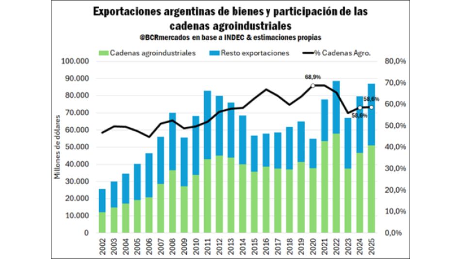 Las cadenas agroindustriales siguen siendo el corazón de las ventas externas. En 2025, el sector alcanzó ventas por USD 51.070 millones, el tercer total nominal más alto de la historia, explicando el 58,6% del total exportado. Sin embargo, la BCR destaca un proceso de diversificación interesante.