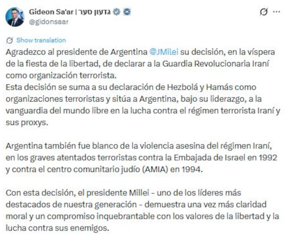 El canciller israelí, Gideon Sa’ar, agradeció a Javier Milei por declarar a la Guardia Revolucionaria de Irán como organización terrorista. La medida vincula a esta estructura con los atentados a la AMIA y la Embajada de Israel, reforzando las alertas de Interpol.