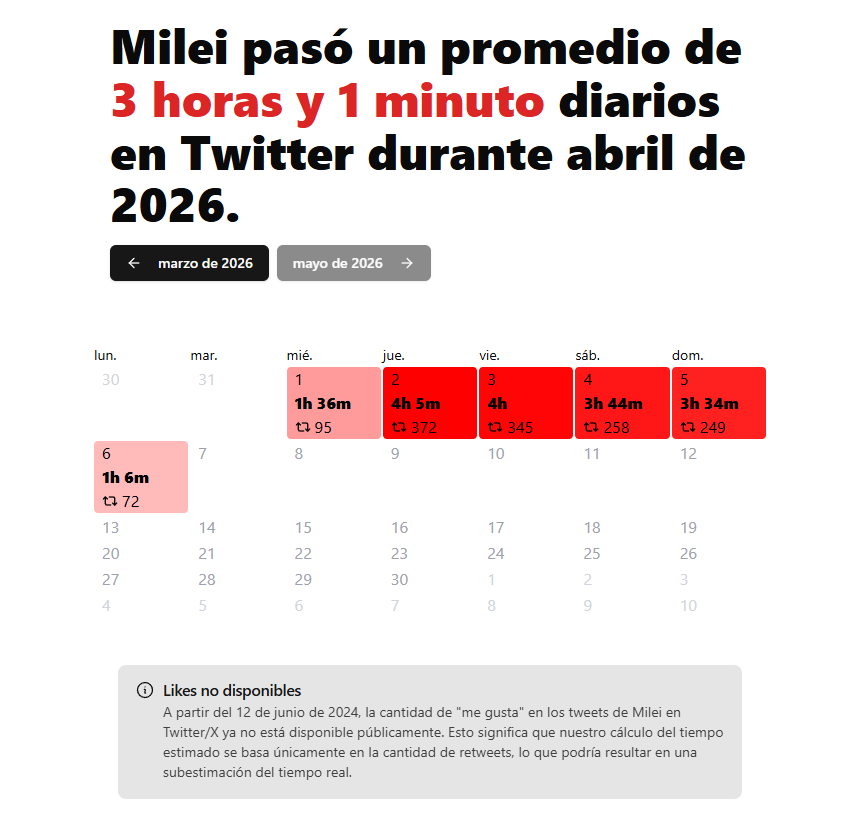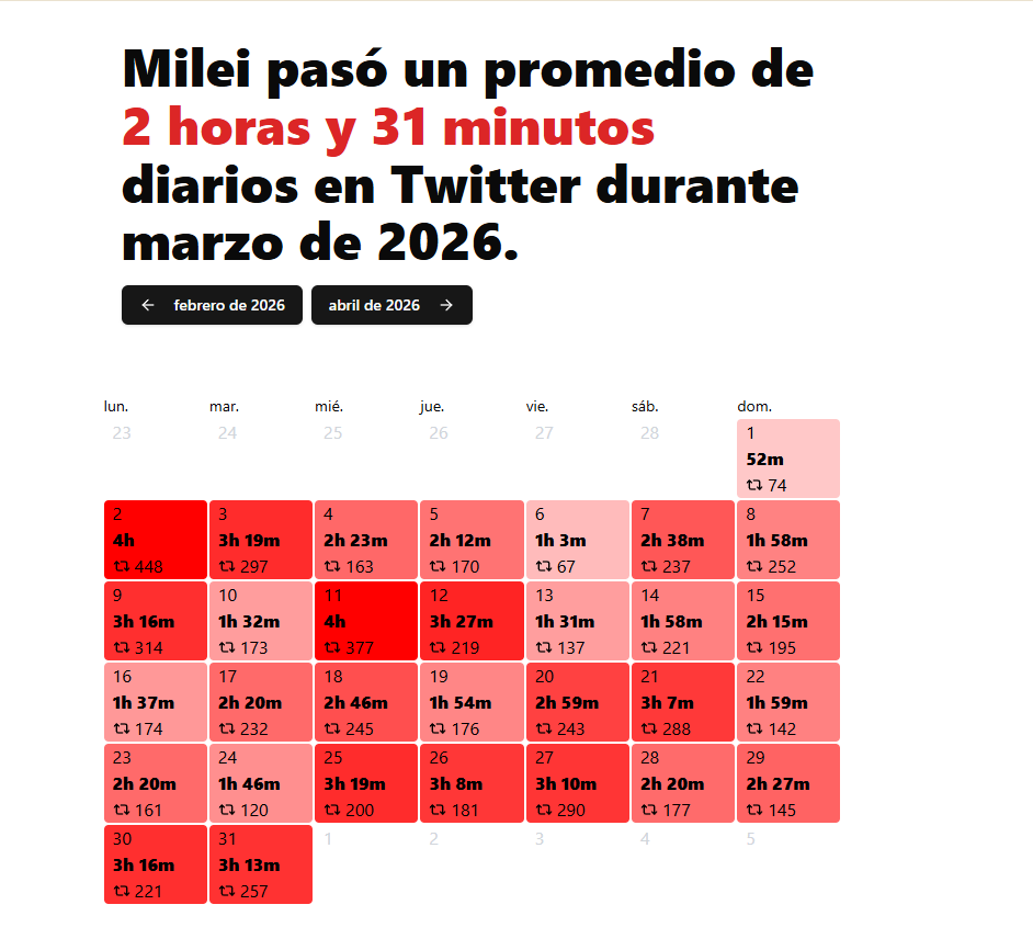 Un análisis de la actividad digital de Javier Milei revela que su tiempo en Twitter creció un 20% en el último mes. Durante marzo de 2026, el mandatario acumuló un total de 78 horas y 11 minutos de interacción, con picos de actividad que coinciden con la agenda legislativa.