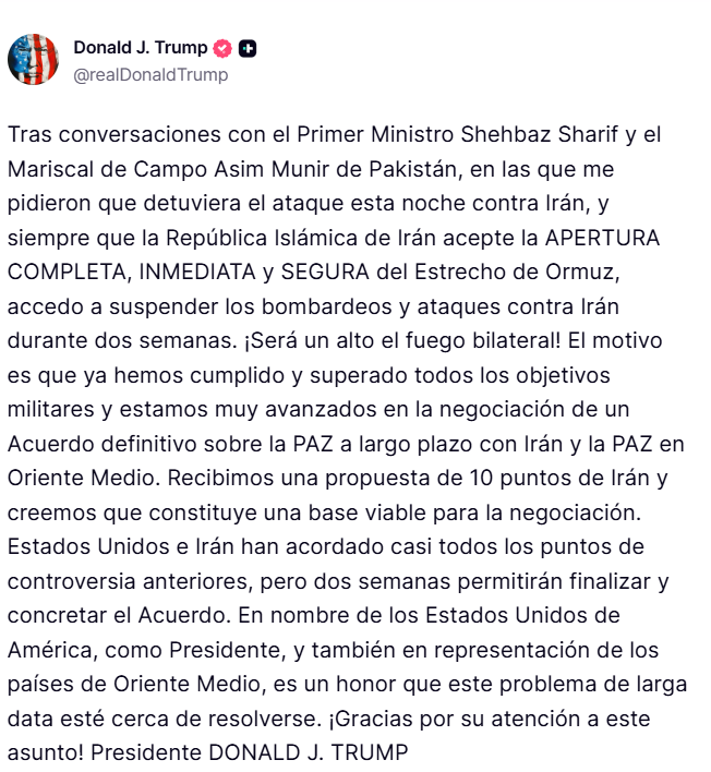 La República Islámica de Irán y los Estados Unidos de América acordaron un alto el fuego inmediato que entró en vigor a las 3:30 horas de este miércoles, según lo anunciado por el Consejo Supremo de Seguridad Nacional de Irán y confirmado por la mediación de Pakistán.