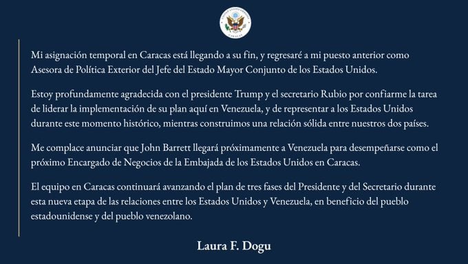 El gobierno de Estados Unidos anunció este miércoles un ajuste estratégico en su representación diplomática en Venezuela. Laura Dogu, quien lideró la reapertura de la embajada en Caracas tras la captura de Nicolás Maduro, finalizará su misión temporal. En su lugar, el Departamento de Estado designó a John Barrett, un diplomático de carrera con perfil operativo y amplia trayectoria en seguridad regional.