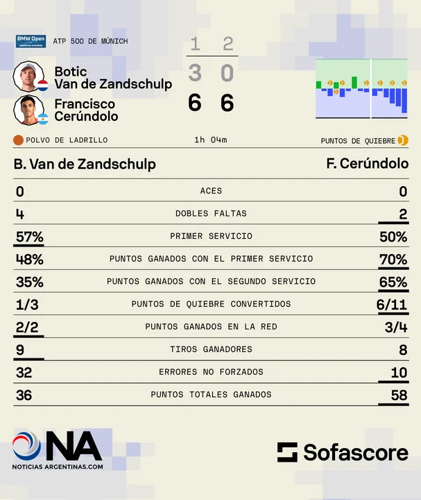 El primer set fue relativamente parejo, aunque Cerúndolo fue muy efectivo para quebrar el saque de su rival en tres oportunidades, mientras que el neerlandés lo hizo en solo una, para empezar a tomar ventaja.