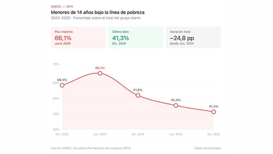 El reporte destaca que la pobreza infantil en el país descendió 24,8 puntos porcentuales desde el máximo de 66,1% registrado en junio de 2024. A partir de ese techo crítico, los indicadores comenzaron a ceder de manera constante hasta llegar al 41,3% en diciembre de 2025.