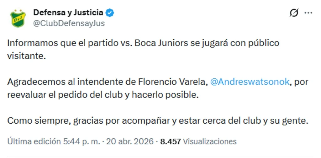 Sin embargo, el club del sur de la Provincia de Buenos Aires no se bajó de las negociaciones y le insistió al intendente Watson para que ceda, acción que finalmente tomó y, por la tarde, el club anunció el acuerdo: “Informamos que el partido vs Boca Juniors se jugará con público visitante. Agradecemos al intendente de Florencio Varela, Andrés Watson por reevaluar el pedido del club y hacerlo posible. Como siempre, gracias por acompañar y estar cerca del club y su gente”.