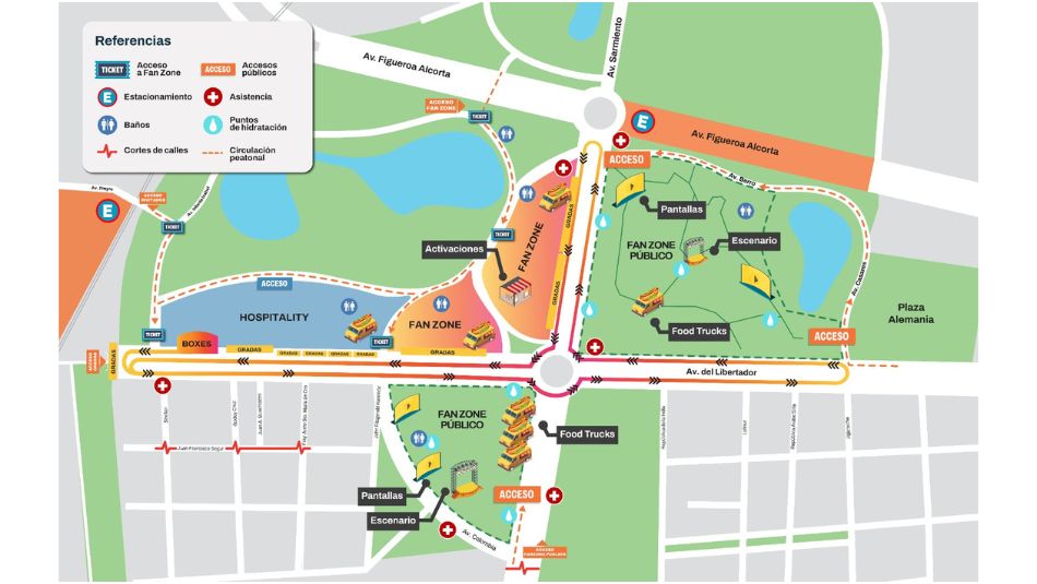 En las Fan Zones públicas de Plaza Seeber (ingreso por Sarmiento y Colombia) y Plaza Sicilia (por Casares y Libertador, y Berro y Sarmiento) habrá escenarios con pantallas y una programación con shows, DJs y la actuación de la Orquesta Sinfónica de la Ciudad.