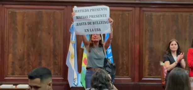 La madre de Matilda Angeleri, quien se suicidó por bullying en un colegio de la UBA, recibió el diploma póstumo de su hija. Usó el acto para mostrar un cartel clamando: “¡Basta de bullying en la UBA!”, y responsabilizó a la institución por su falta de acción.